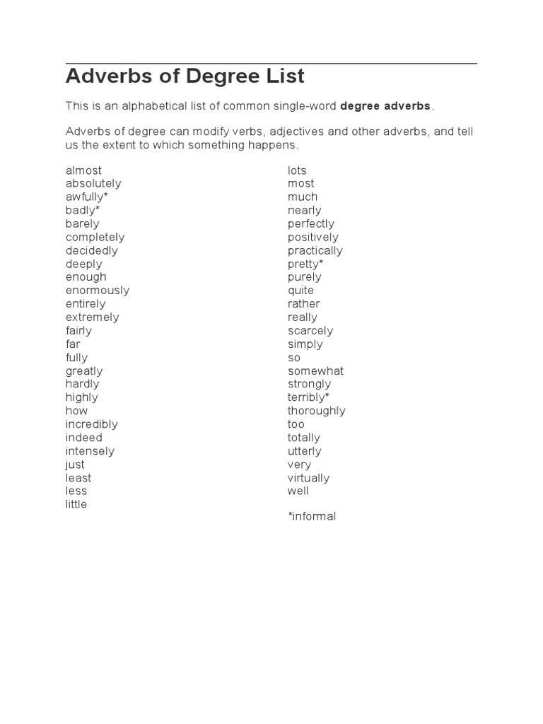 A full list of prepositions (no singing required). Intensifiers are the opposite of mitigators, which are used to decrease the intensity of the words recommended for you. An adverb expresses things like time, frequency, manner, place, quantity, or intensity. Adverbs of degree are adverbs which tell us about the extent of or the intensity of something. Otherwise it is a verb form, gerund (noun), or adjective.